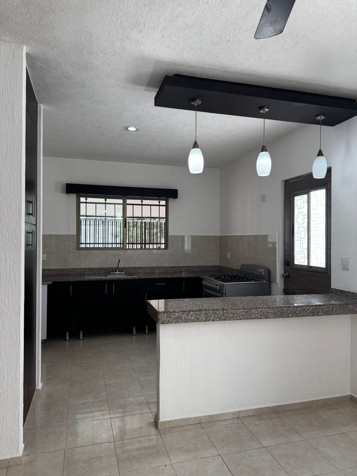 • Barra desayunador y cocina vestida con gavetas, alacena y estufa.