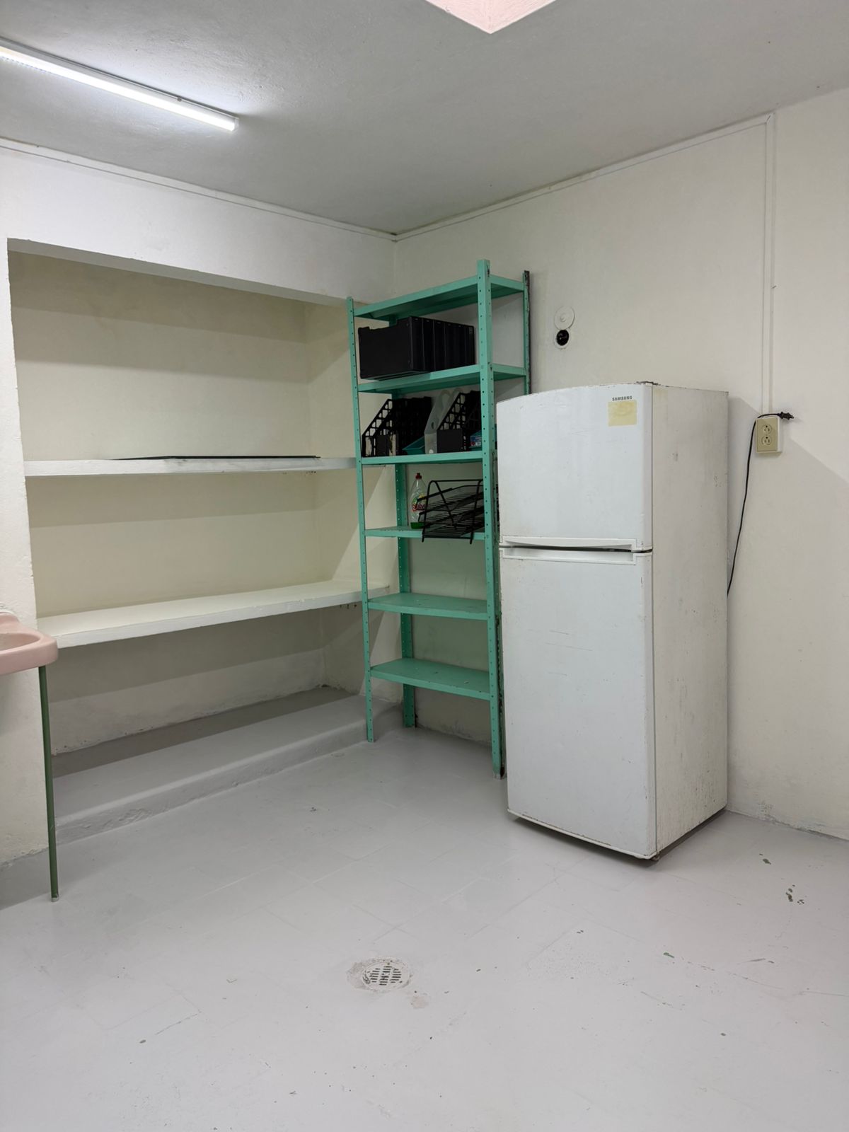 Al fondo se encuentra el área de comedor y bodega, equipada con refrigerador, estanterías y lavamanos, junto a un baño completo que complementa perfectamente el espacio.
